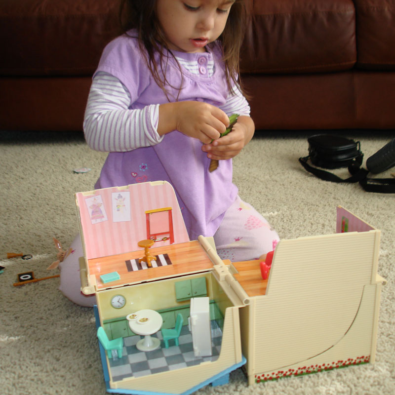 One of the positive things about the pirate ship is that it doesn’t come with accessories like cannons or weapons. The assortment is non-offensive; like no scary skull or crossbones flags. A 3-year old can convert the playset from house to pirate ship or vice versa very easily. But the latches are very flimsy. Good luck securing the latches on this toy! When Miss A carried the house with all the contents inside of it, the playset opened up and all the tiny accessories fell out. This happened a few times. Also, there are no other hands on deck, besides the little cute parrot. Olivia has no friends to share in her pirate adventures or to play in the house. There are permanent pictures of her family members in the windows of the house though. Miss A asked at one point, “Where is Ian?” Or even Julian would’ve been nice to play with since it is her best friend.