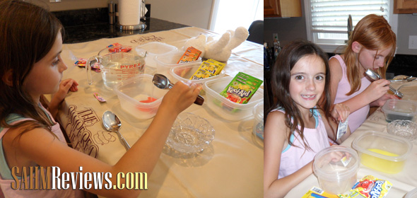 I prepared the first bowl and the girls did the rest. Two packets of Kool-Aid, 2 ounces of water and a 1/2 tablespoon of vinegar. Stir well and go!