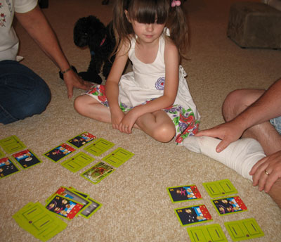 Too Many Monkeys: This game involves a deck of cards where the goal is to attain the numbers 1-6. Everyone starts with 6 cards facing down and taking turns, you attempt to get them all flipped upright.  In the same style as gin (the game, not the drink!), you can draw from the stack or from the discard pile.  If you draw a 4, you replace the 4th card in your row and unhide the new number.  If it’s a 3, you replace the 3rd card in the row and continue until you duplicate a card or flip a card that halts your turn. Sound complicated but it’s not… Miss K (4 at the time we received the game) followed along just fine.