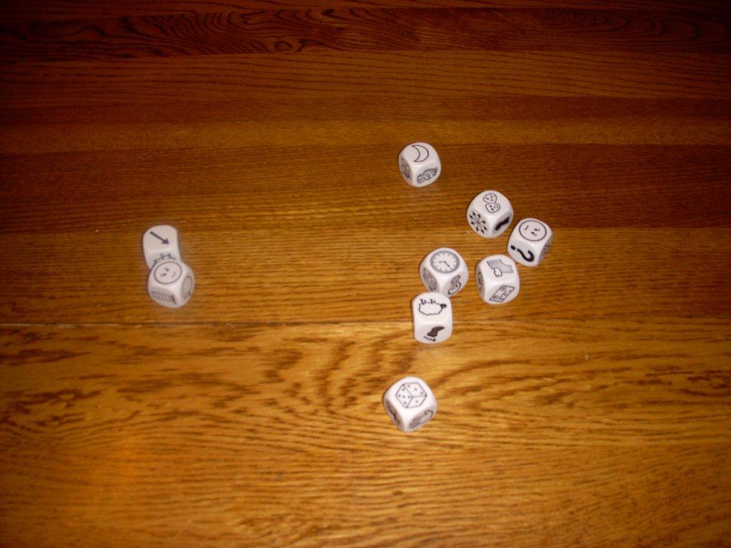 The first time we played the game there were three of us: my 7 year old son, 5 year old daughter and myself. The game suggests that it is for ages 8 and up but my children really wanted to play it. It was before school so to keep it short we each took three dice and rolled. We then each told a story with our three dice. Since we had enough time we decided to make one long story out of all nine dice and took turns picking which of our dice we would use. It turned out to be pretty humorous.