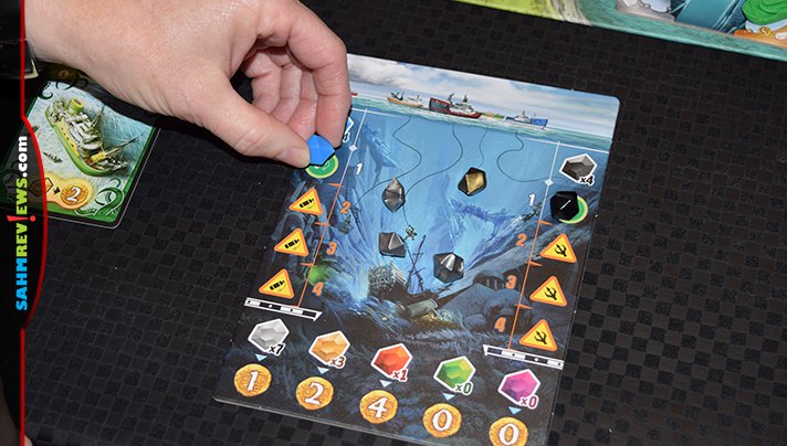 Each red, gold or silver gem drawn from the bag represents treasures that may be brought to the surface, while black and blue gems represent hazards. The first instance of a black or blue gem doesn’t do anything other than provide a warning to all players. When a second example of either of these colors is drawn, all players still in the dive must defend themselves against the hazard by either playing a matching colored card or having their boat in the correct colored scouting spot on the Wreck Tile. If they cannot, they must resurface and lose the chance to score points for collected gems. They will still earn points for any cards they played up to that point.