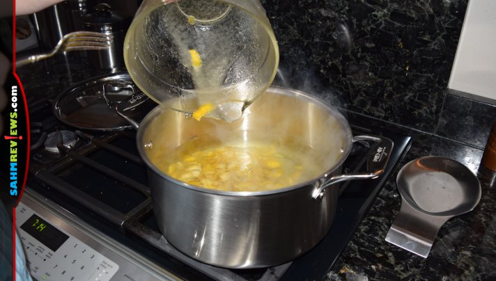 Once the rest time has passed (don’t cheat on the 9-12 hours!), bring a large pot of 12 cups of water to a rolling boil. Turn off the heat and add the peels and oil/sugar mixture to the water. Stir the lemon ‘soup’ gently for about 5 minutes to make sure all of the sugar is completely dissolved.